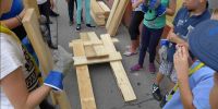 Die Wanderklasse darf beim Schulstartfest der Volksschule Wolkersdorf im Weinviertel mit den Kindern die Leonardobrücke bauen.